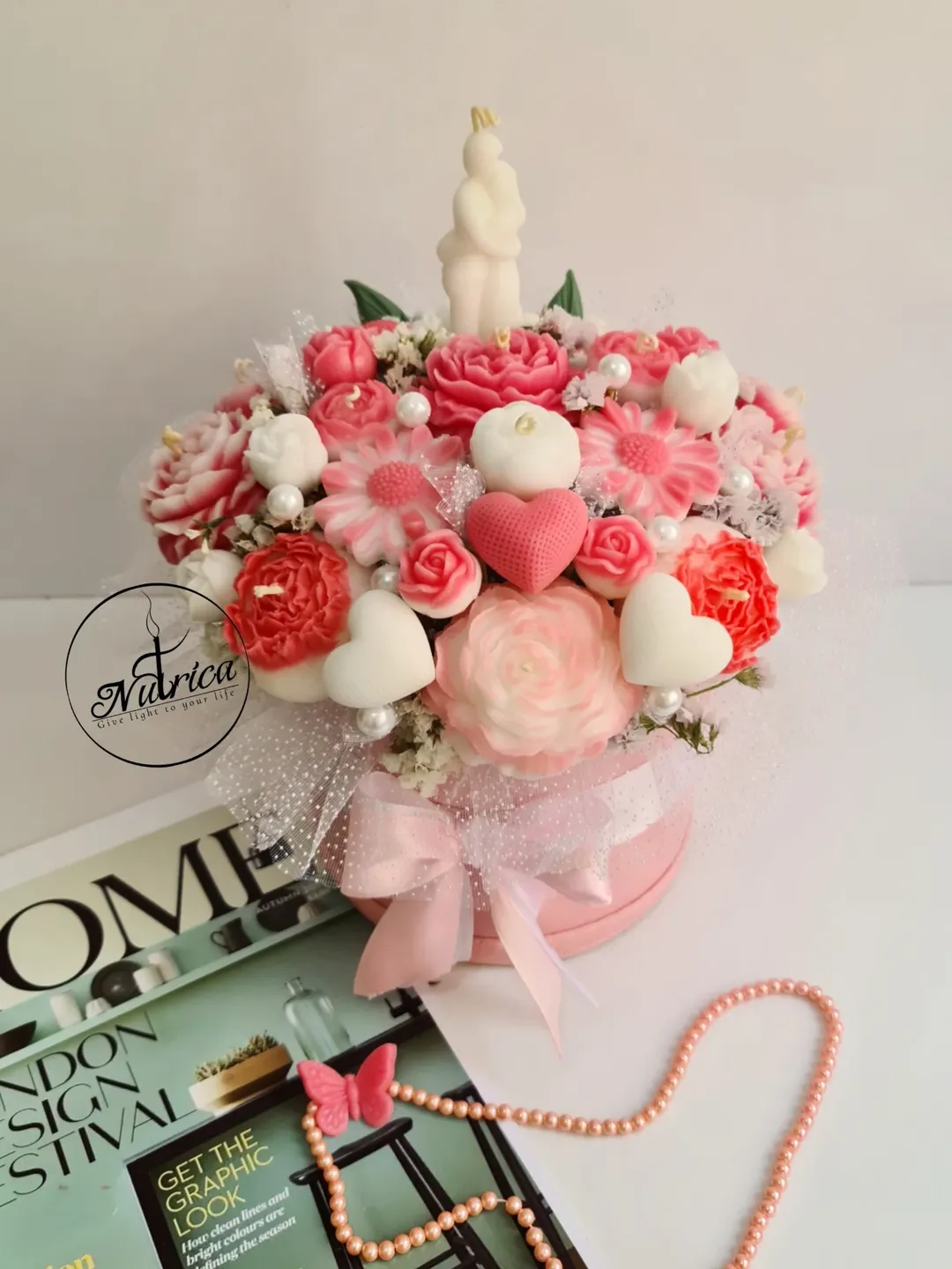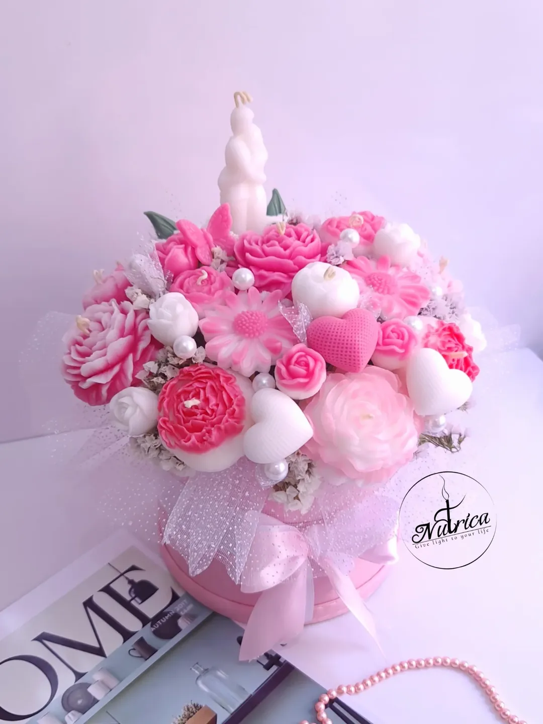 ○ ترکیبی از شمع های گل سفید و صورتی و دیزاین شده با شمع آغوشی و قلب ، تور و مروارید یه باکس شیک و زیبا برای هدیه به عشقتون