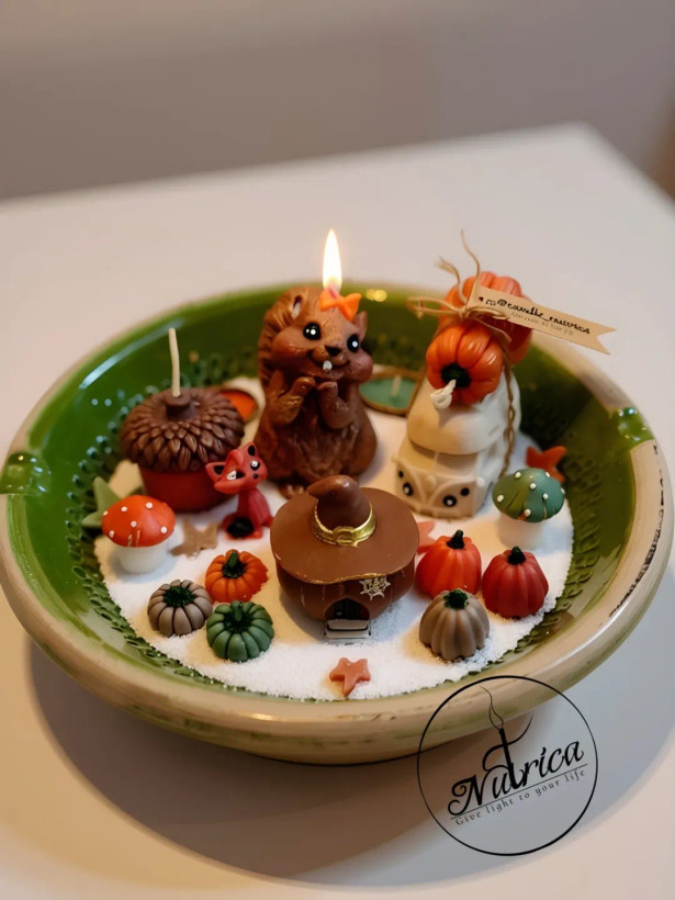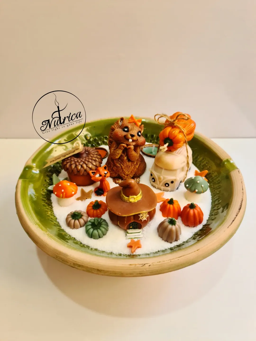 ● یه ظرف سفالی ساخته شده از خاک پر از نمک دریایی و چیده شده با شمع هایی از جنس نور شامل سنجاب کوچولو و بلوط خوشمزه، ماشین فولکس و کلی کدوهای سایز متفاوت و کلبه کدوی هالوینی. مناسب برای روی میز جلو مبلی، میز ناهارخوری و عسلی.