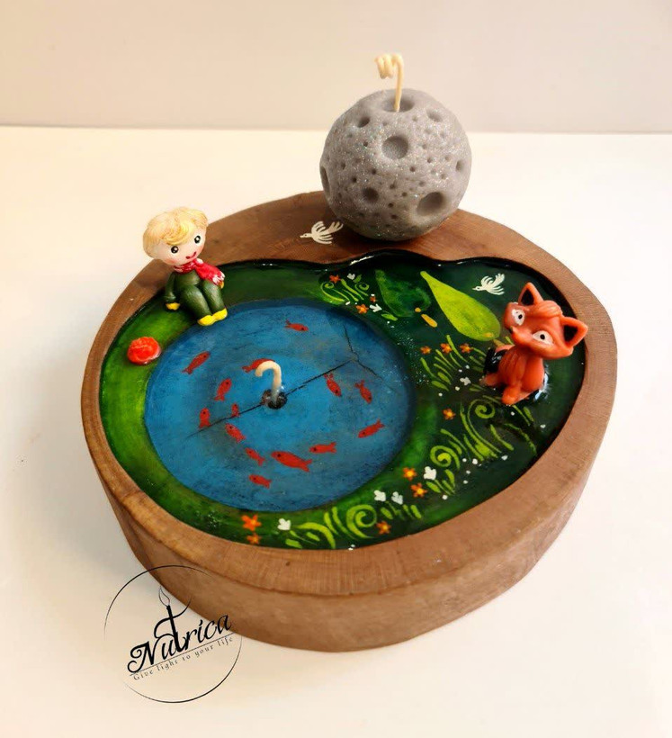 شمع شازده کوچولو به همراه ماه ، روباه و گل قرمزش روی پایه چوبی نقاشی شده